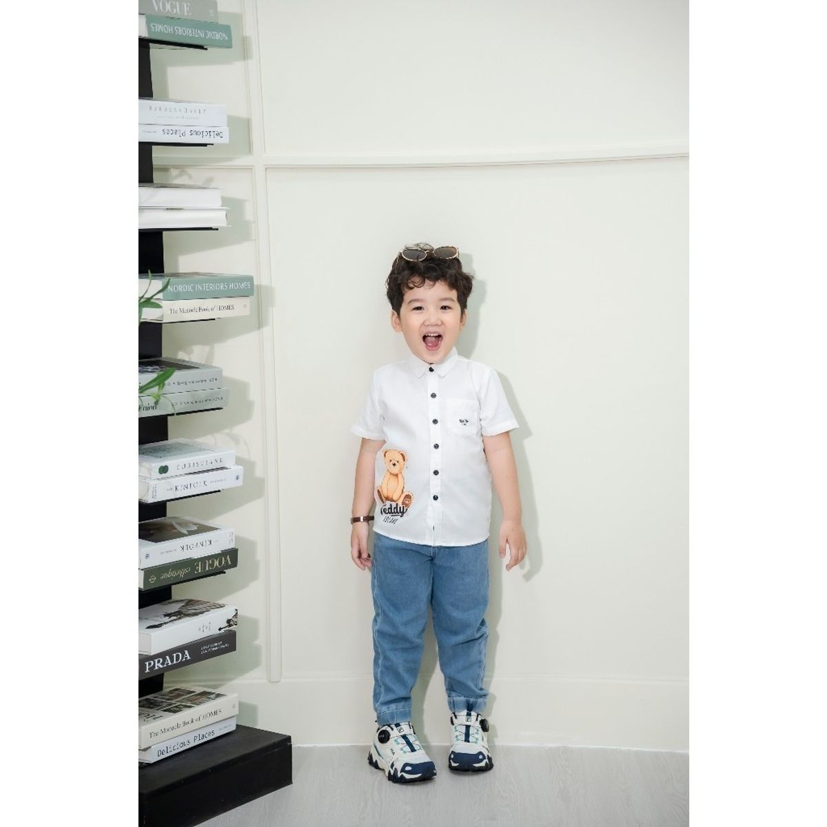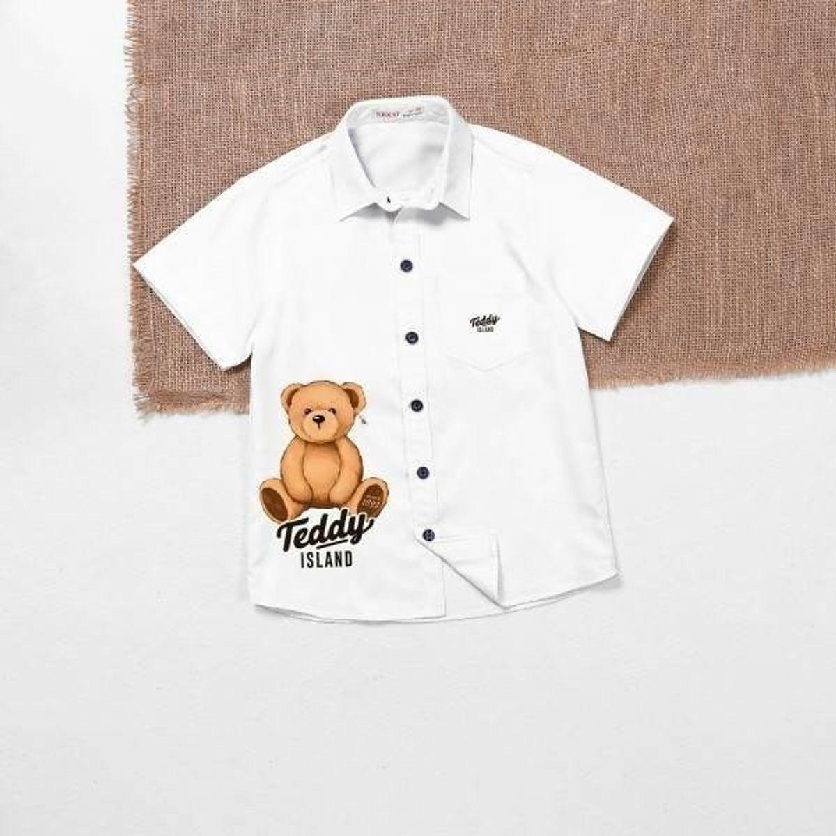 Áo Sơ Mi Trắng Ngắn Tay In Họa Tiết Gấu Và Xe KHUYẾN MÃI - ƯU ĐÃI