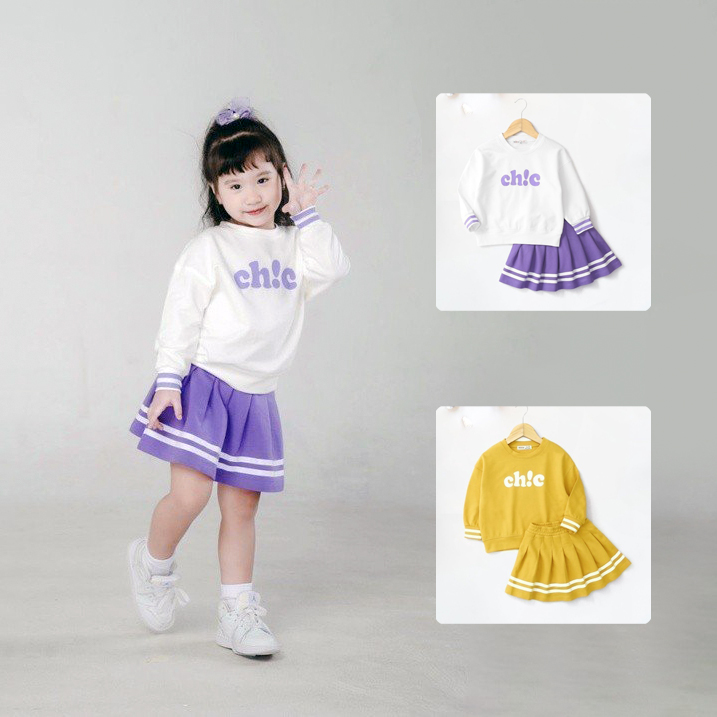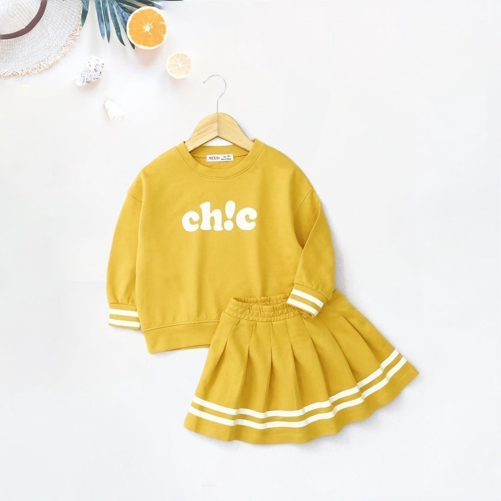 Set Bé Gái Áo Sweater Kèm Chân Váy Viền Sọc In Chữ Chic